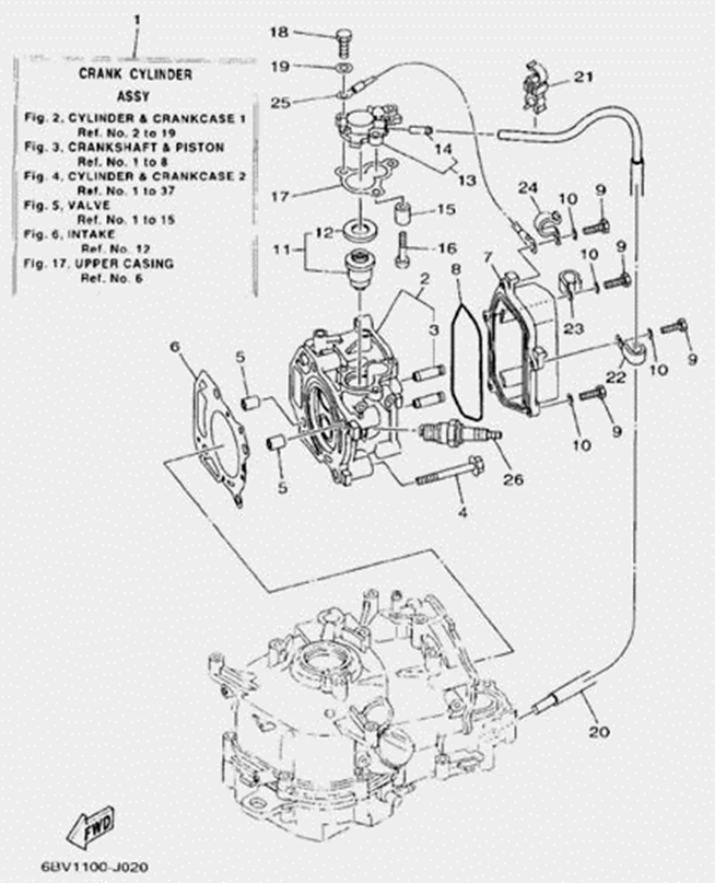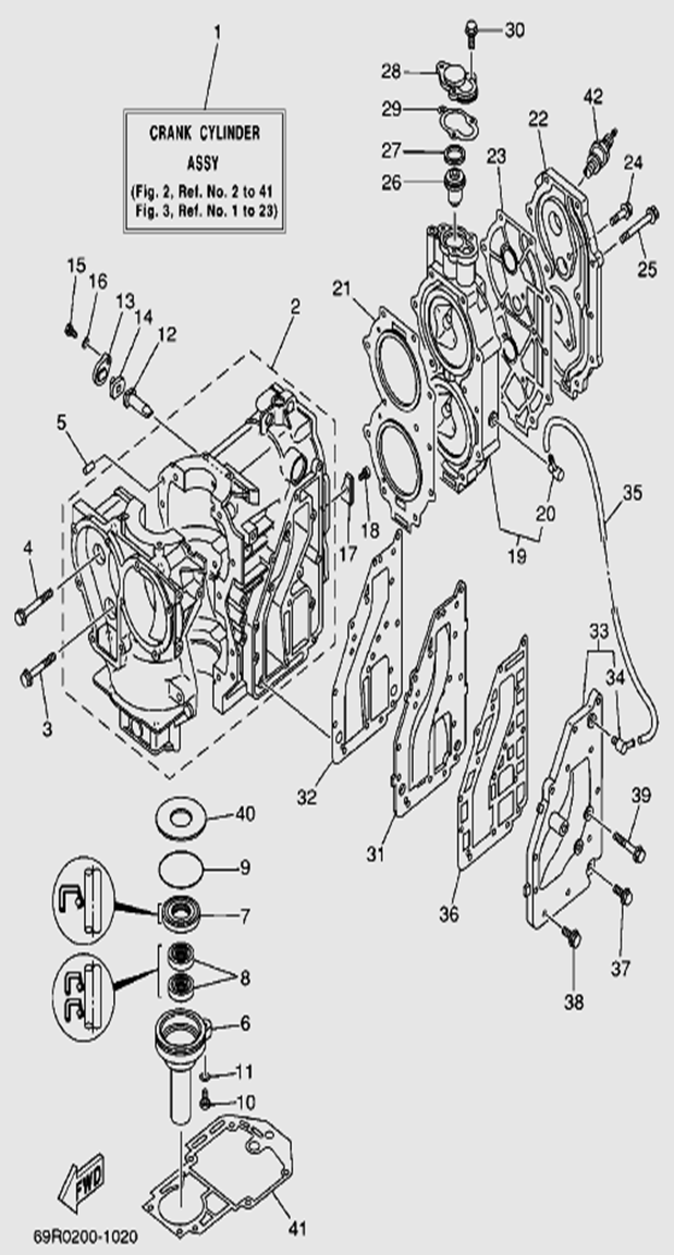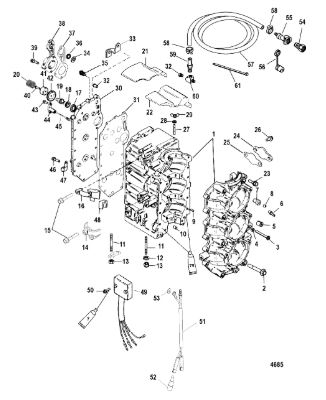 Блок цилиндров и картер (Часть 1) 2-Х ТАКТНОГО ПЛМ MERCURY 50EO Серийный номер от 9885345 до 9973099